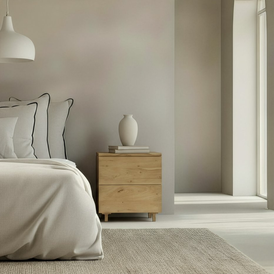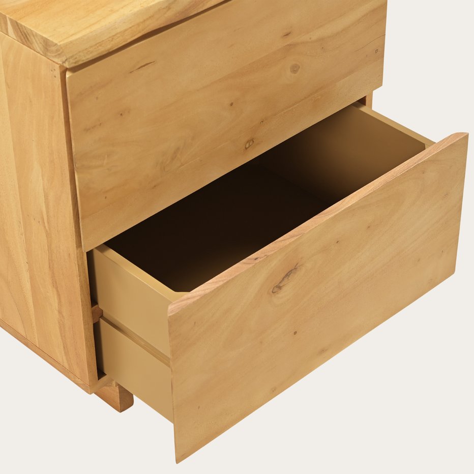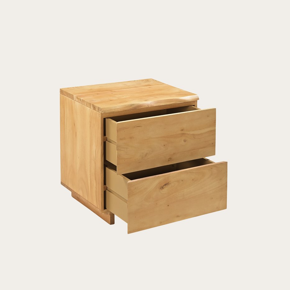- La mesita de noche Livenza combina funcionalidad y diseño natural en una pieza elaborada con madera maciza de acacia. Su acabado en tono natural realza la belleza de las vetas y la autenticidad de un material noble y sostenible. Con líneas depuradas y un diseño exclusivo Banak Premium, aporta equilibrio, calidez y personalidad al dormitorio. Ideal para completar el conjunto con el cabecero Livenza, esta mesita refleja la artesanía y la elegancia atemporal de la marca, transformando tu habitación en un espacio sereno, organizado y lleno de armonía.