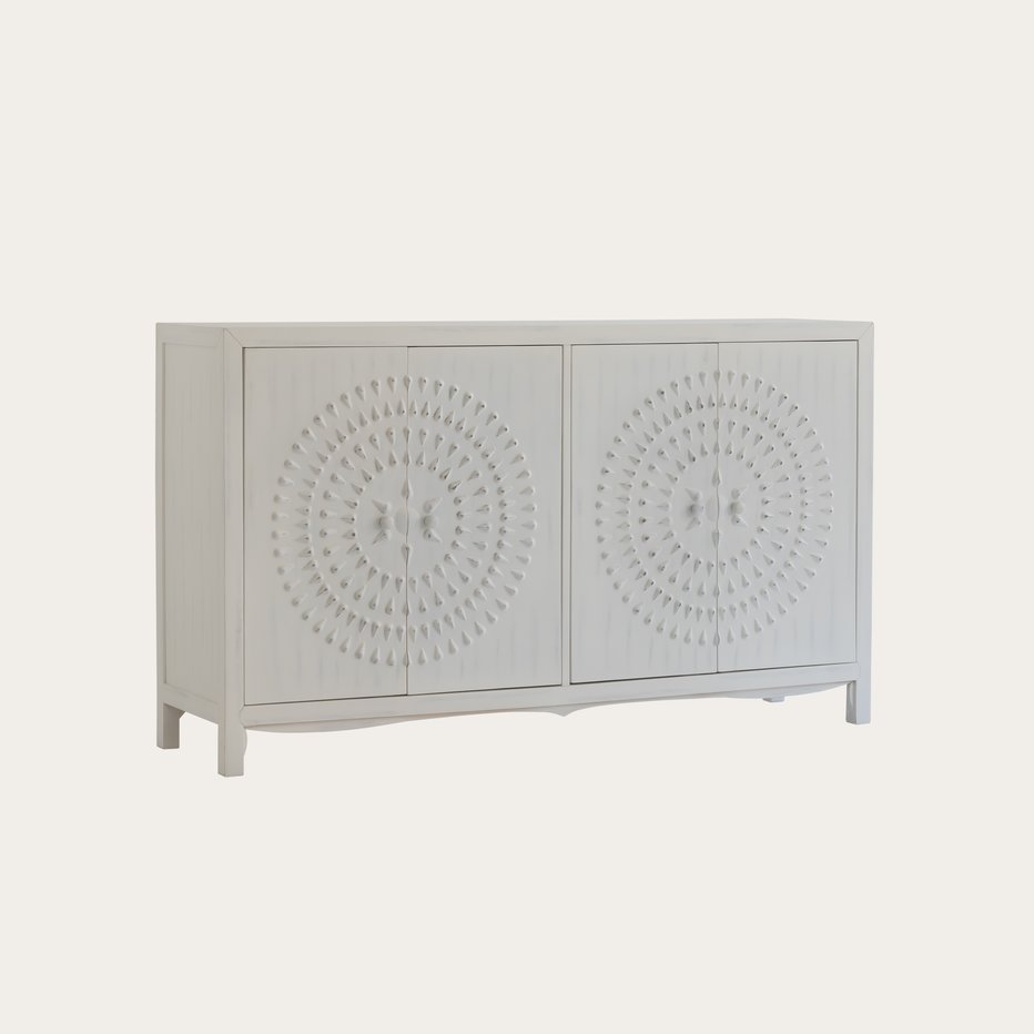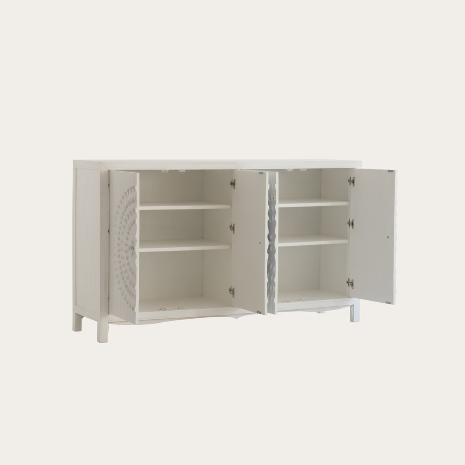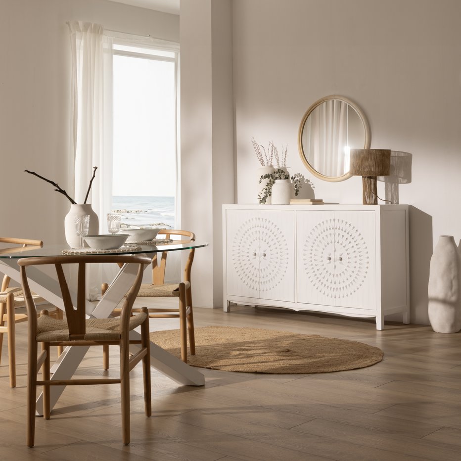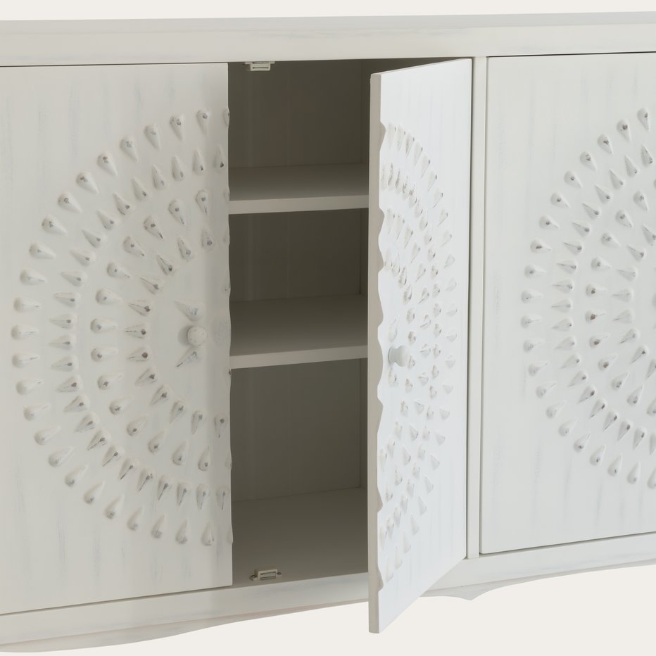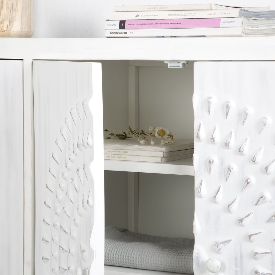 - El aparador de 154cm de la colección Delhi se convertirá en la pieza protagonista de tu comedor. En acabado blanco antic este mueble de contención te permitirá ganar un considerable espacio de almacenaje en casa, debido a sus estudiadas dimensiones, largo 154cm, fondo de 40cm y su altura de 90cm, así como por supuesto, al espacio de almacenaje que esconden las 4 puertas de madera que definen el mueble. A nivel estético cabe destacar los dos grandes rosetones tallados en madera que decoran el frontal, así como la moldura que viste el zócalo del mueble. Decídete por el aparador Delhi y aporta ese toque étnico a tu hogar que tan en boga está actualmente.