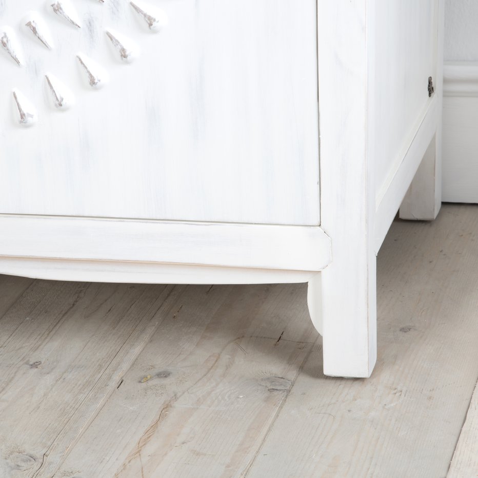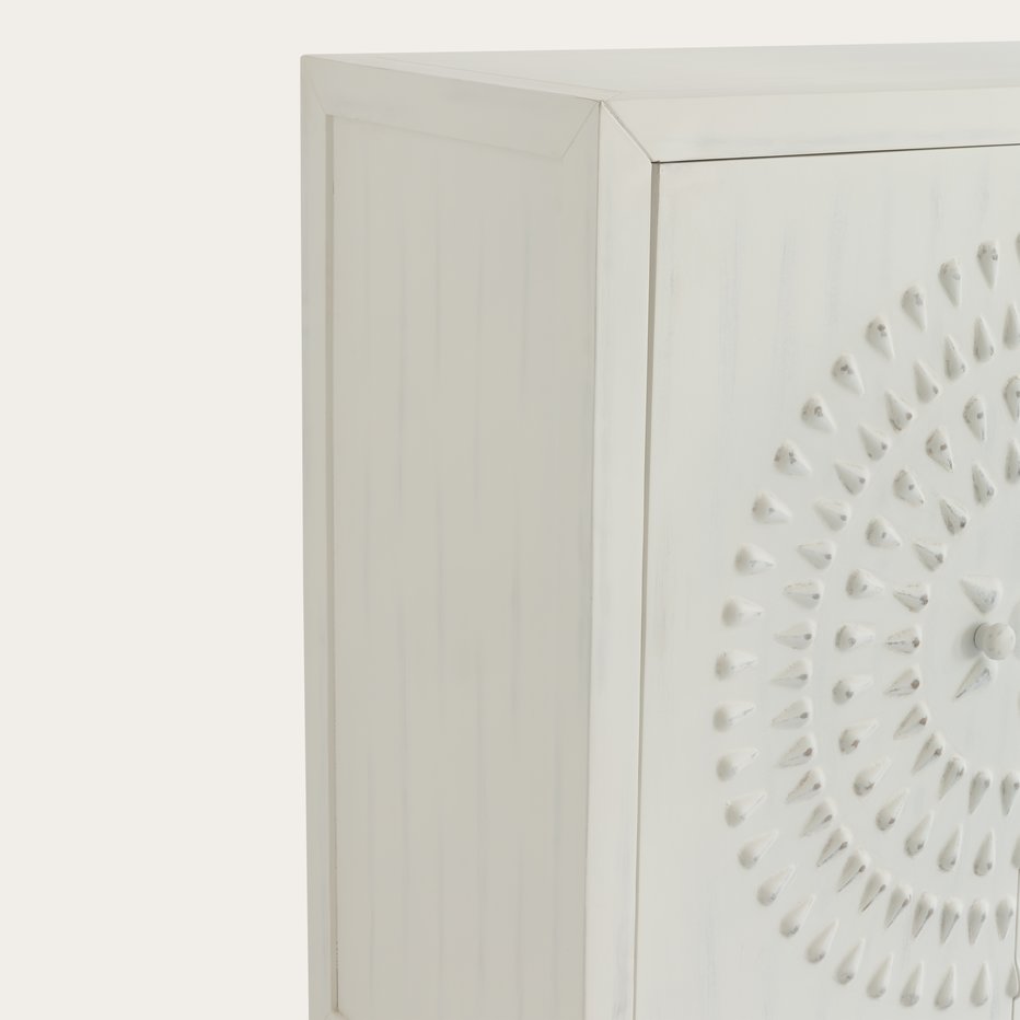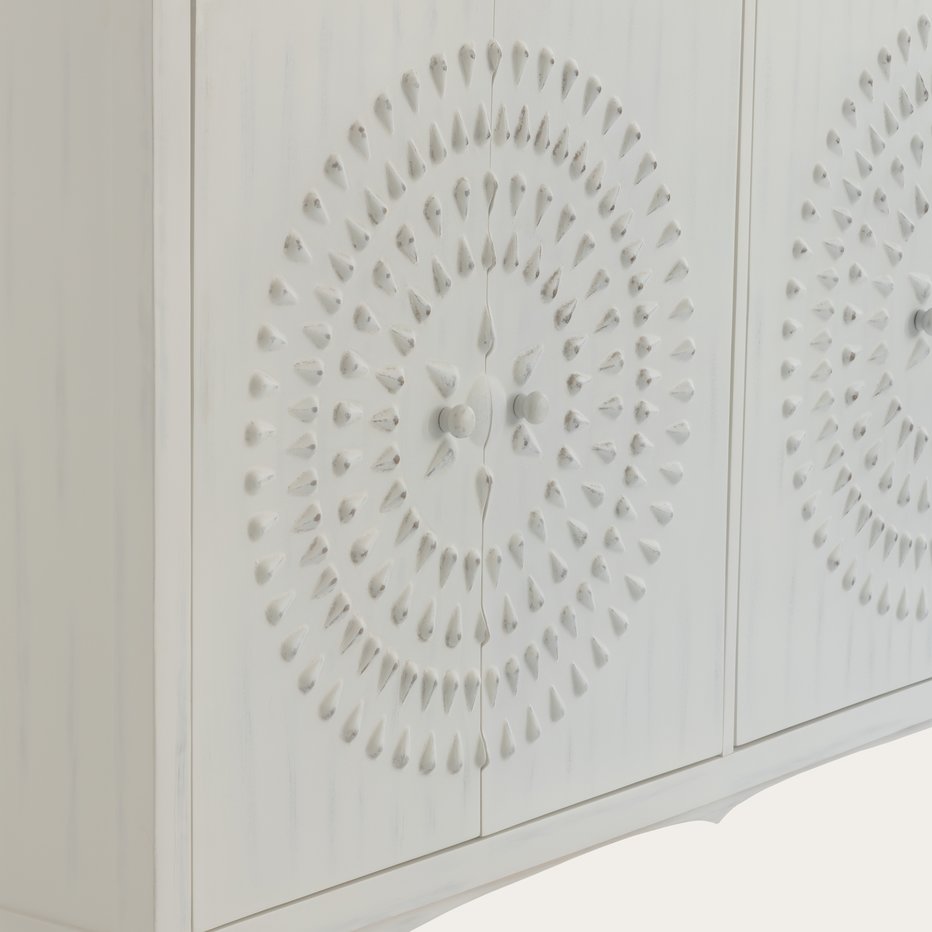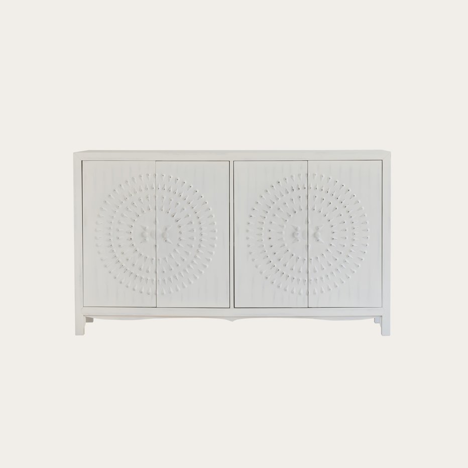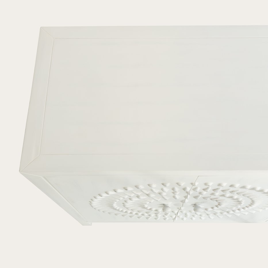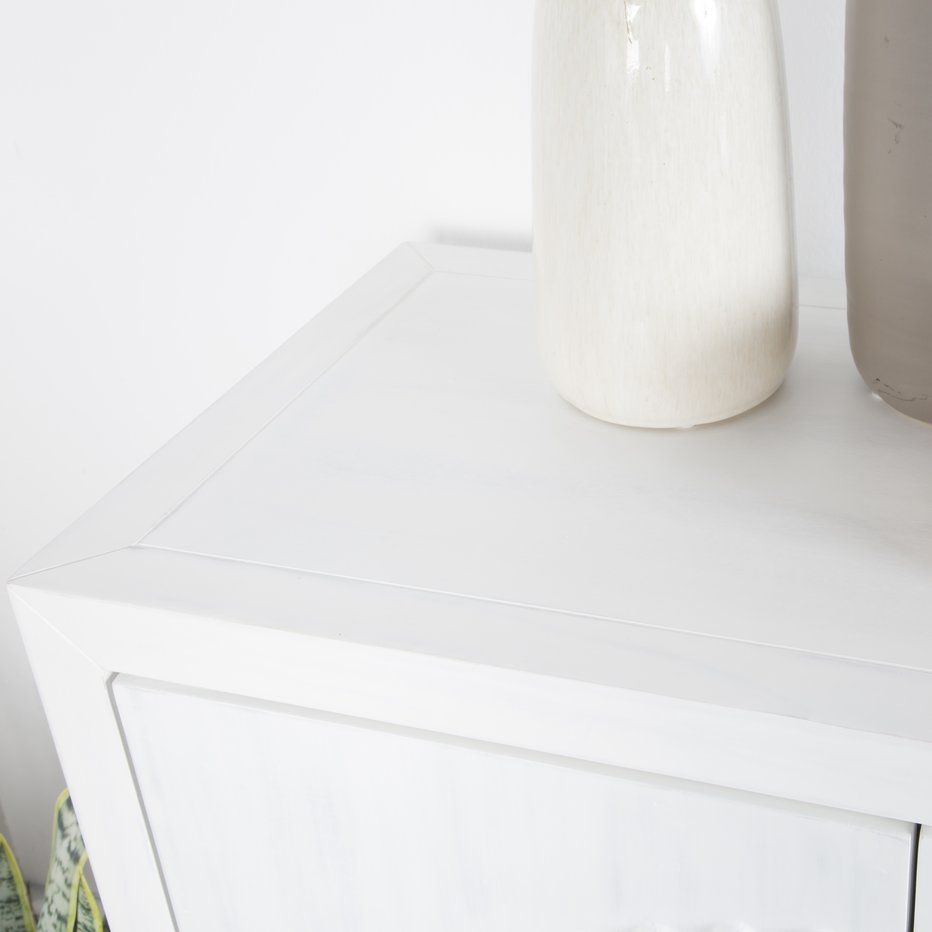 - El aparador de 154cm de la colección Delhi se convertirá en la pieza protagonista de tu comedor. En acabado blanco antic este mueble de contención te permitirá ganar un considerable espacio de almacenaje en casa, debido a sus estudiadas dimensiones, largo 154cm, fondo de 40cm y su altura de 90cm, así como por supuesto, al espacio de almacenaje que esconden las 4 puertas de madera que definen el mueble. A nivel estético cabe destacar los dos grandes rosetones tallados en madera que decoran el frontal, así como la moldura que viste el zócalo del mueble. Decídete por el aparador Delhi y aporta ese toque étnico a tu hogar que tan en boga está actualmente.
