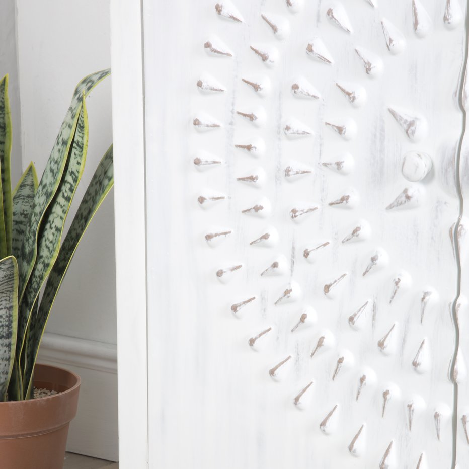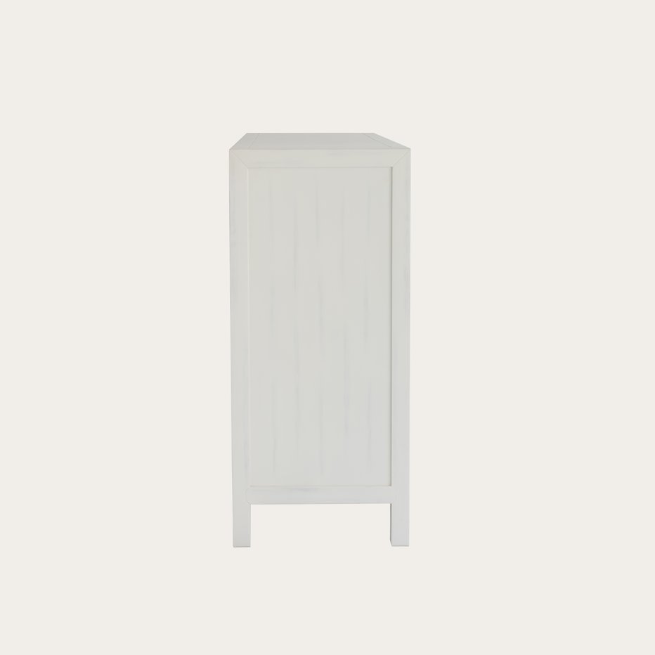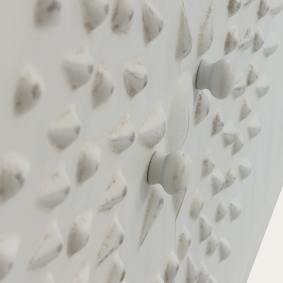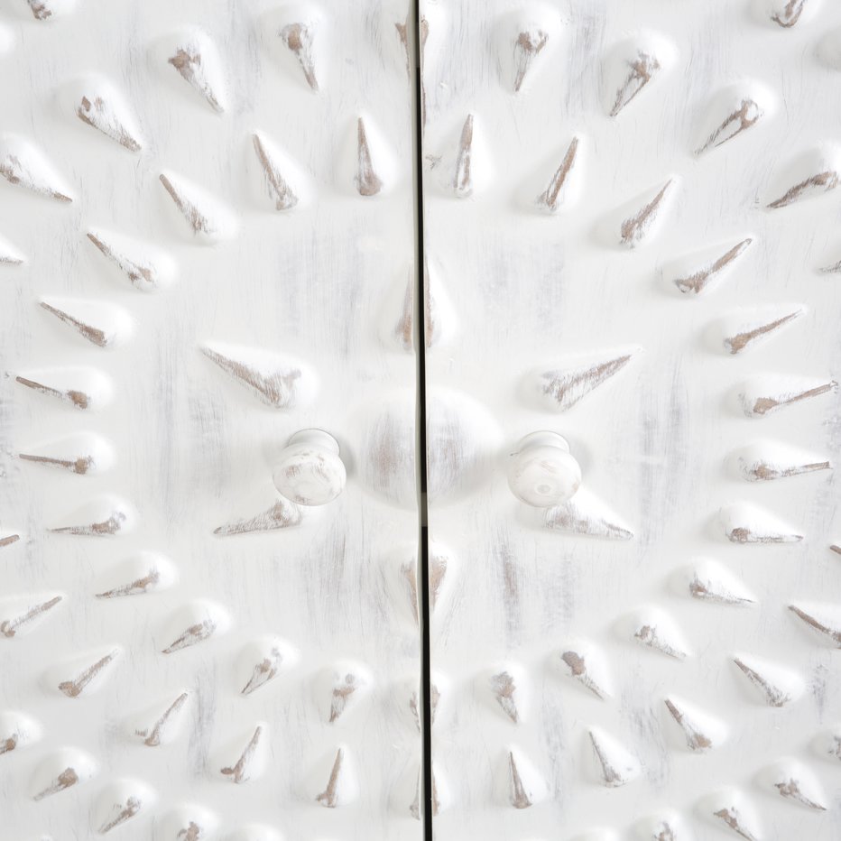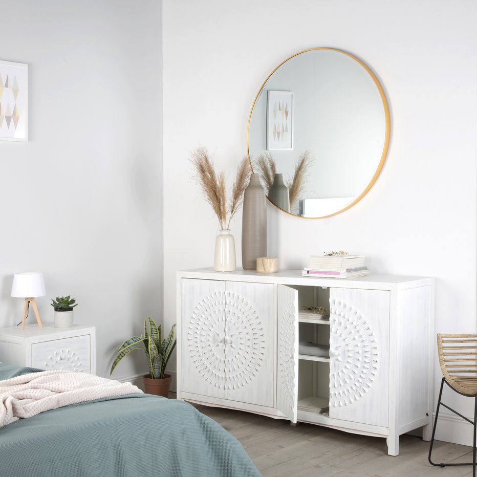 - El aparador de 154cm de la colección Delhi se convertirá en la pieza protagonista de tu comedor. En acabado blanco antic este mueble de contención te permitirá ganar un considerable espacio de almacenaje en casa, debido a sus estudiadas dimensiones, largo 154cm, fondo de 40cm y su altura de 90cm, así como por supuesto, al espacio de almacenaje que esconden las 4 puertas de madera que definen el mueble. A nivel estético cabe destacar los dos grandes rosetones tallados en madera que decoran el frontal, así como la moldura que viste el zócalo del mueble. Decídete por el aparador Delhi y aporta ese toque étnico a tu hogar que tan en boga está actualmente.