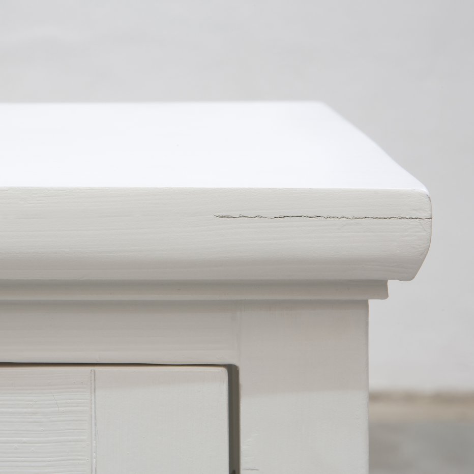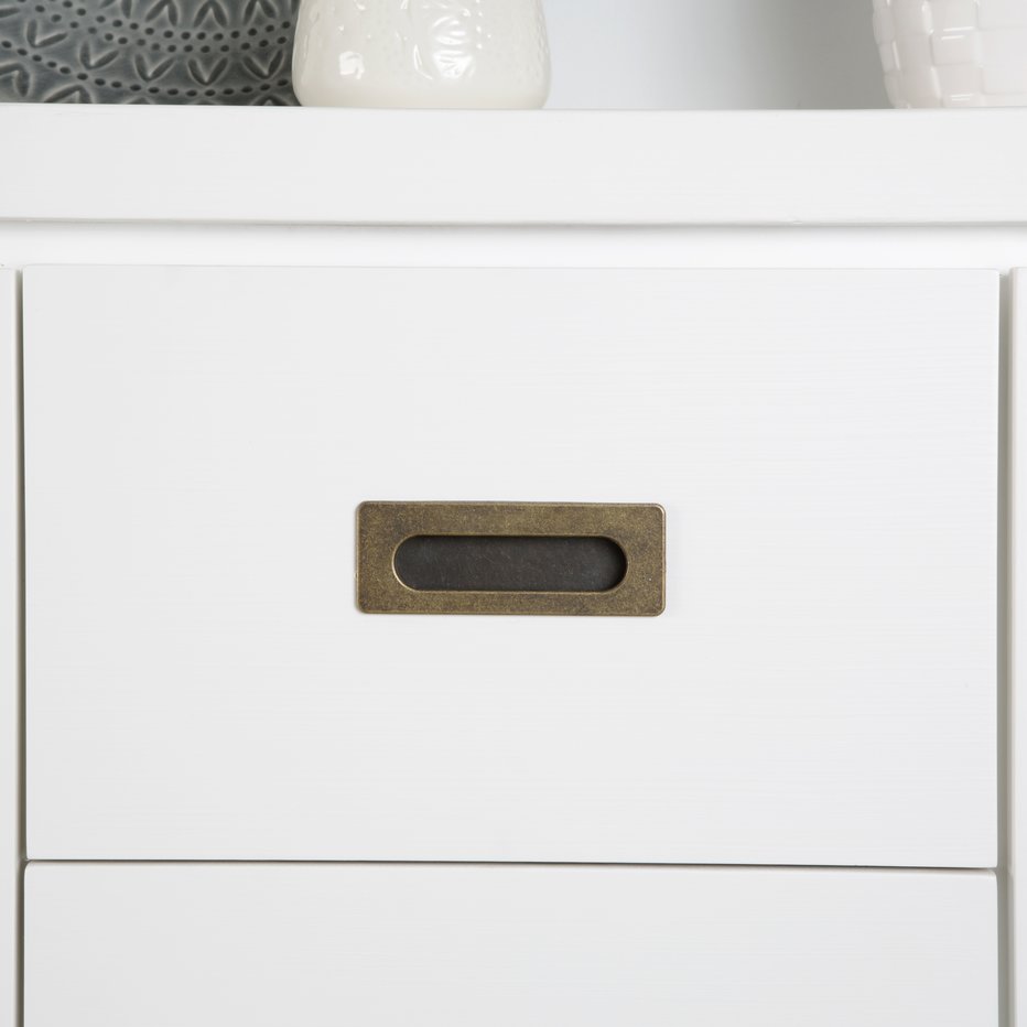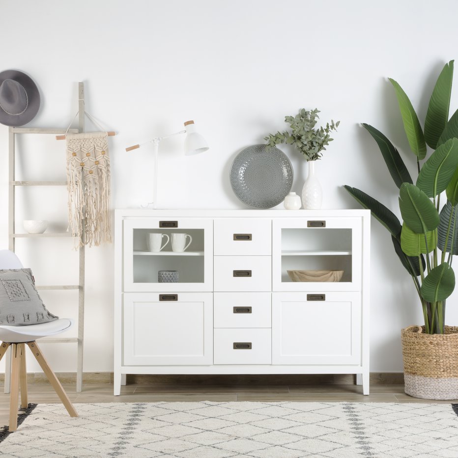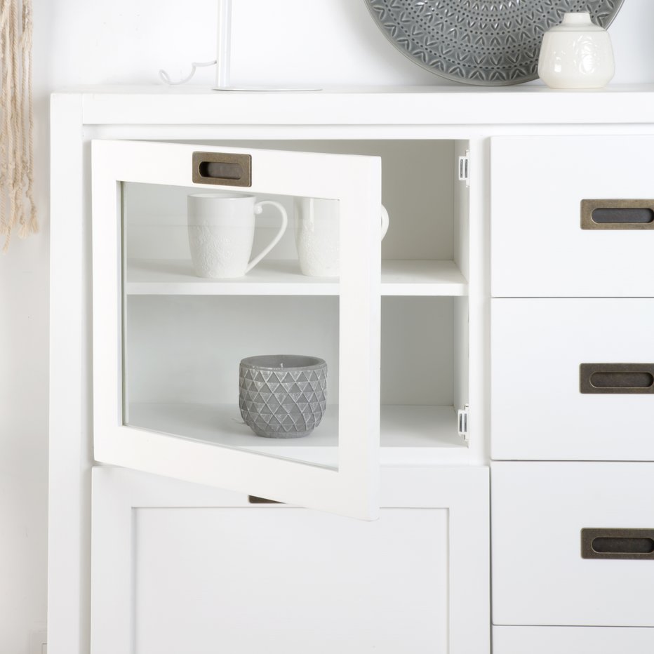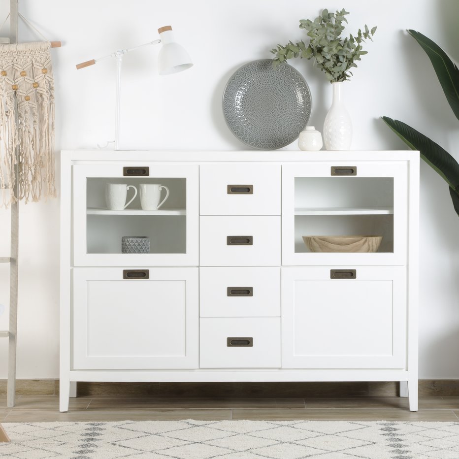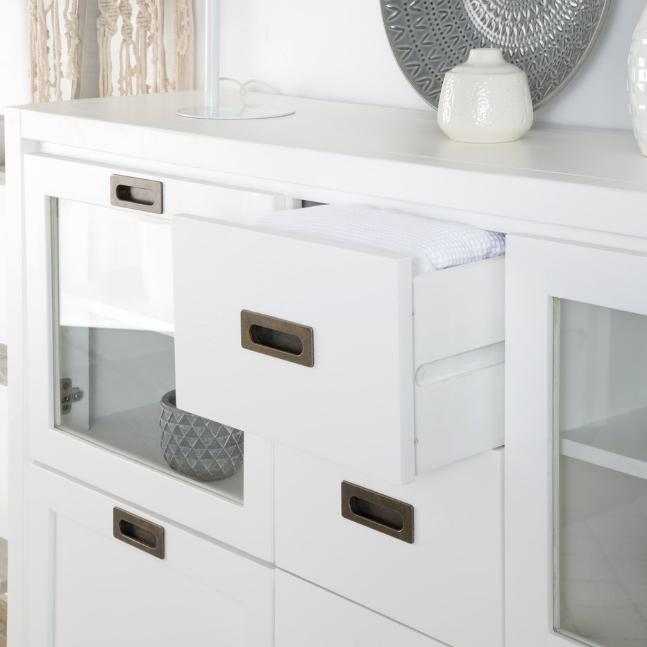 - Podemos definir este aparador estrecho como la pieza auxiliar perfecta para ganar capacidad de almacenaje en nuestro hogar sin desperdiciar un ápice de espacio. Cuenta con 4 cajones idénticos en la parte central de la pieza, que la recorren de arriba hacia abajo, además de 4 puertas de vitrina, 2 a cada lado de los cajones centrales. El espacio interior de ésta está dividido en 2 compartimentos iguales por un estante. Además las 2 puertas superiores están combinadas con cristal, dejando a la vista los elementos que se depositen en su interior. Por otro lado, su diseño de líneas rectas y su fondo contenido (35 cm), hacen que pueda actuar como mueble auxiliar tanto en nuestro comedor, como en nuestra entrada o en otras zonas de paso.