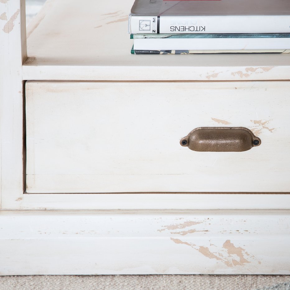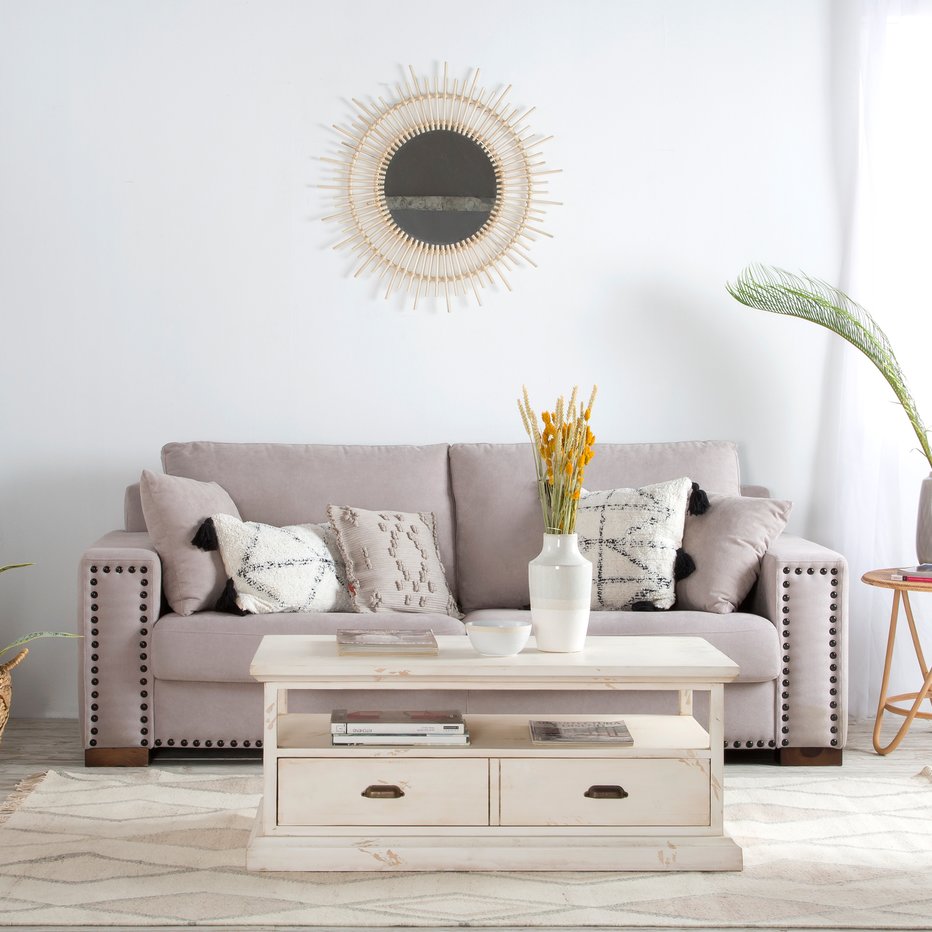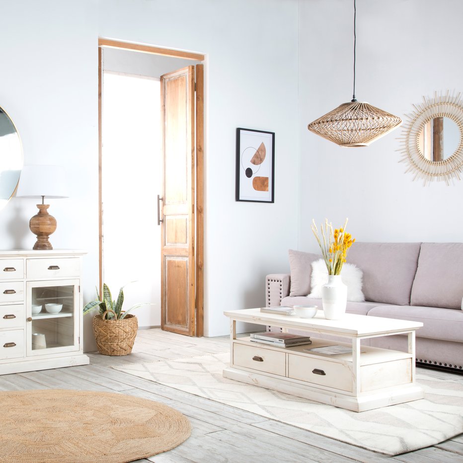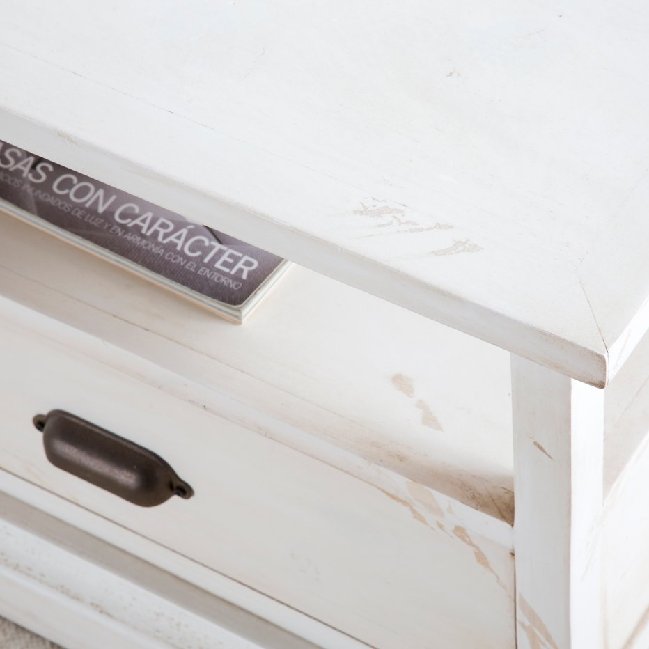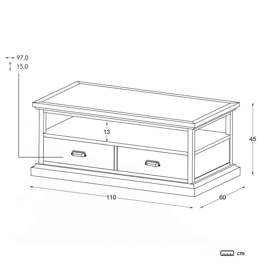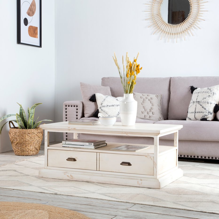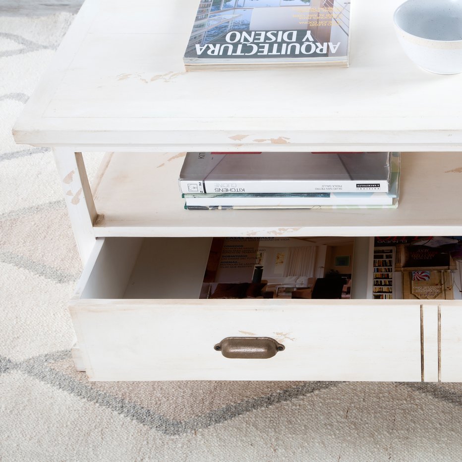 - La mesa de centro de la colección Lino reúne en una sola pieza funcionalidad y distinción. Sus dimensiones, 110 x 60 x 45cm, harán que puedas integrarla fácilmente delante de tu sofá, independientemente del tamaño del mismo. El acabado Blanco Decay de la madera natural con la que está fabricada contrasta a la perfección con los tiradores metálicos en forma de concha de su cajón inferior. La base de la mesa además de un gran cajón horizontal ofrece un espacio de 110 x 60cm donde podrás dejar todo aquello que necesites tener a mano mientras estás en el sofá.